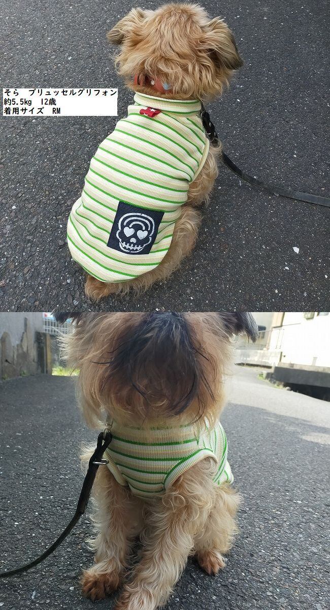 オンライン限定・犬服オリジナル Lサイズ~ ドクロ(ハート目)パッチ グリーン系ボーダーTシャツ犬服202522 #犬服 #ボストンテリア #フレンチブルドッグ #パグ #トイプードル #チワワ #ヨーキー | Cielo Blu/M&R Factory Leather Goods &Dog Good