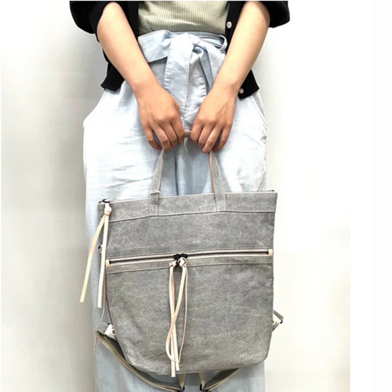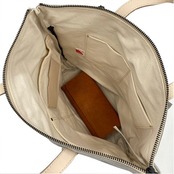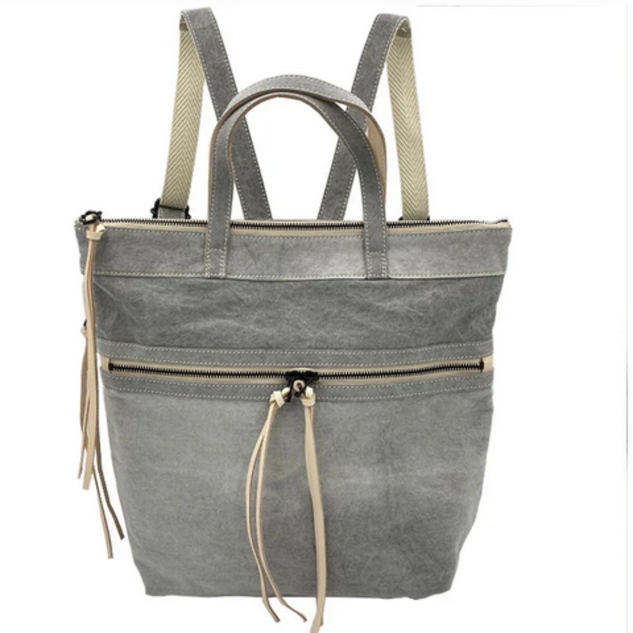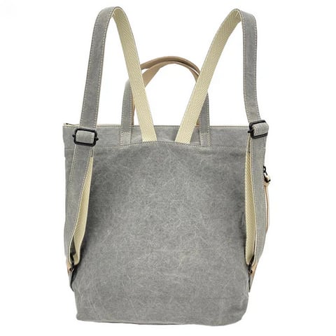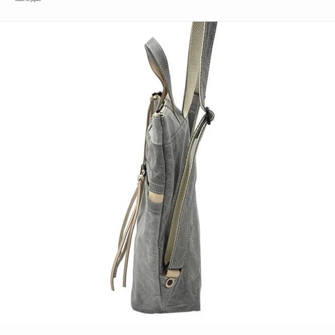 グレーの生地にキナリの革の合わせがおしゃれなリュックです。