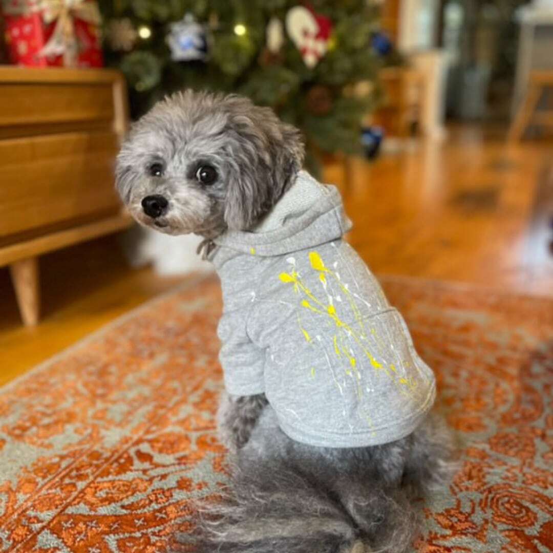 人気!!トレーナ時ペイント加工 定番裏毛ニットフーディわんこ服